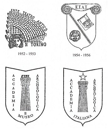 Nel 1952, quando fu fondato l’Ente Teatro Antico di Torino, i promotori gli attribuirono come emblema una mezza gradinata pietrosa (presumibilmente desunta dall’immagine di un antico anfiteatro), recante nella parte sinistra in basso un mascherone teatrale, il tutto contornato sul lato destro dalla dicitura in lettere maiuscole “ENTE TEATRO ANTICO” e sulla base della continuazione “DI TORINO”. Questa simbologia, evidentemente, non soddisfece gli aderenti al sodalizio, tanto che, già un anno dopo, si provvide a sostituirla con un nuovo stemma, costituito da uno scudo sannitico sormontato da un capitello ionico contenente la sigla “E.T.A.T.” in lettere maiuscole; nel campo tagliato furono inseriti una pianta teatrale (a destra) e un mascherone (a sinistra).